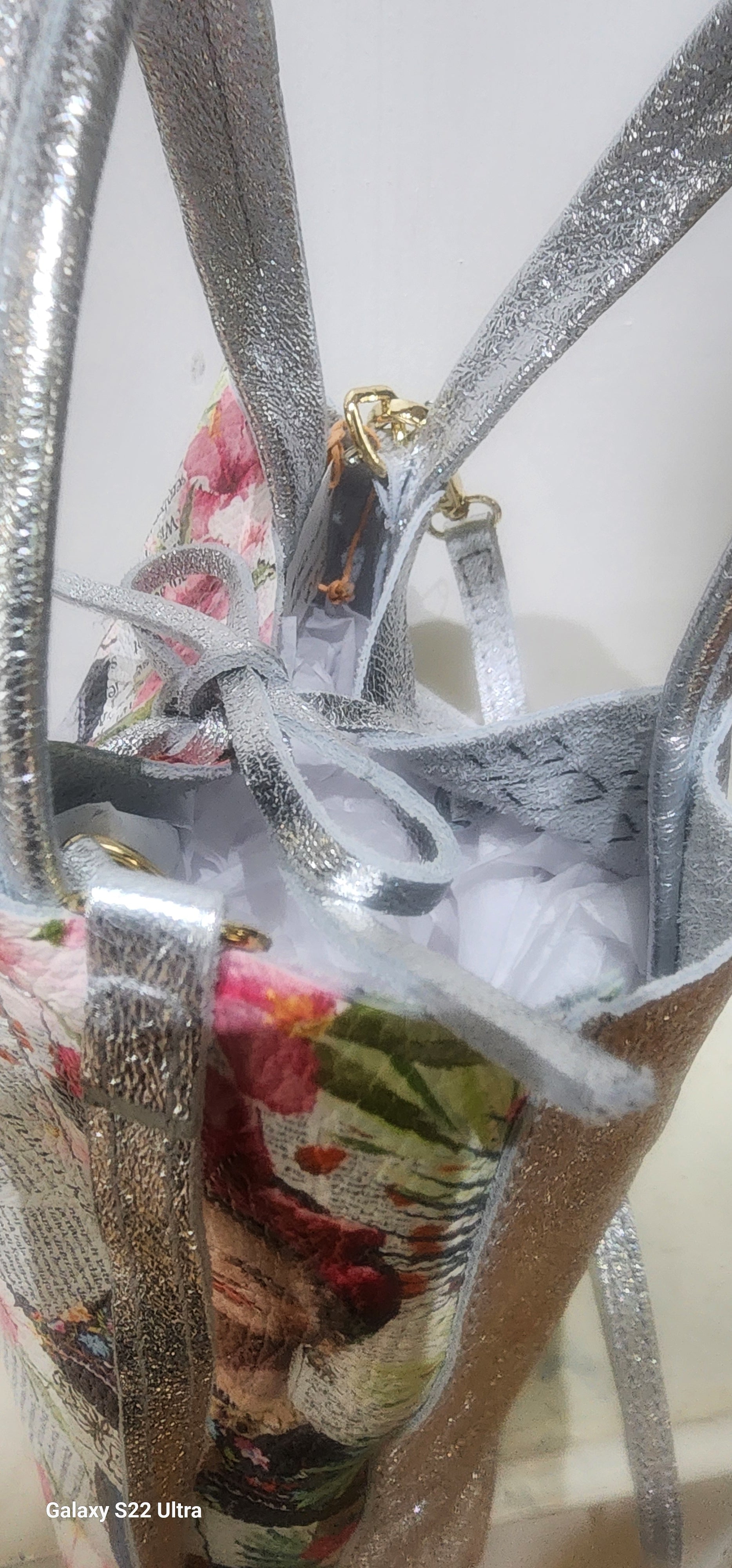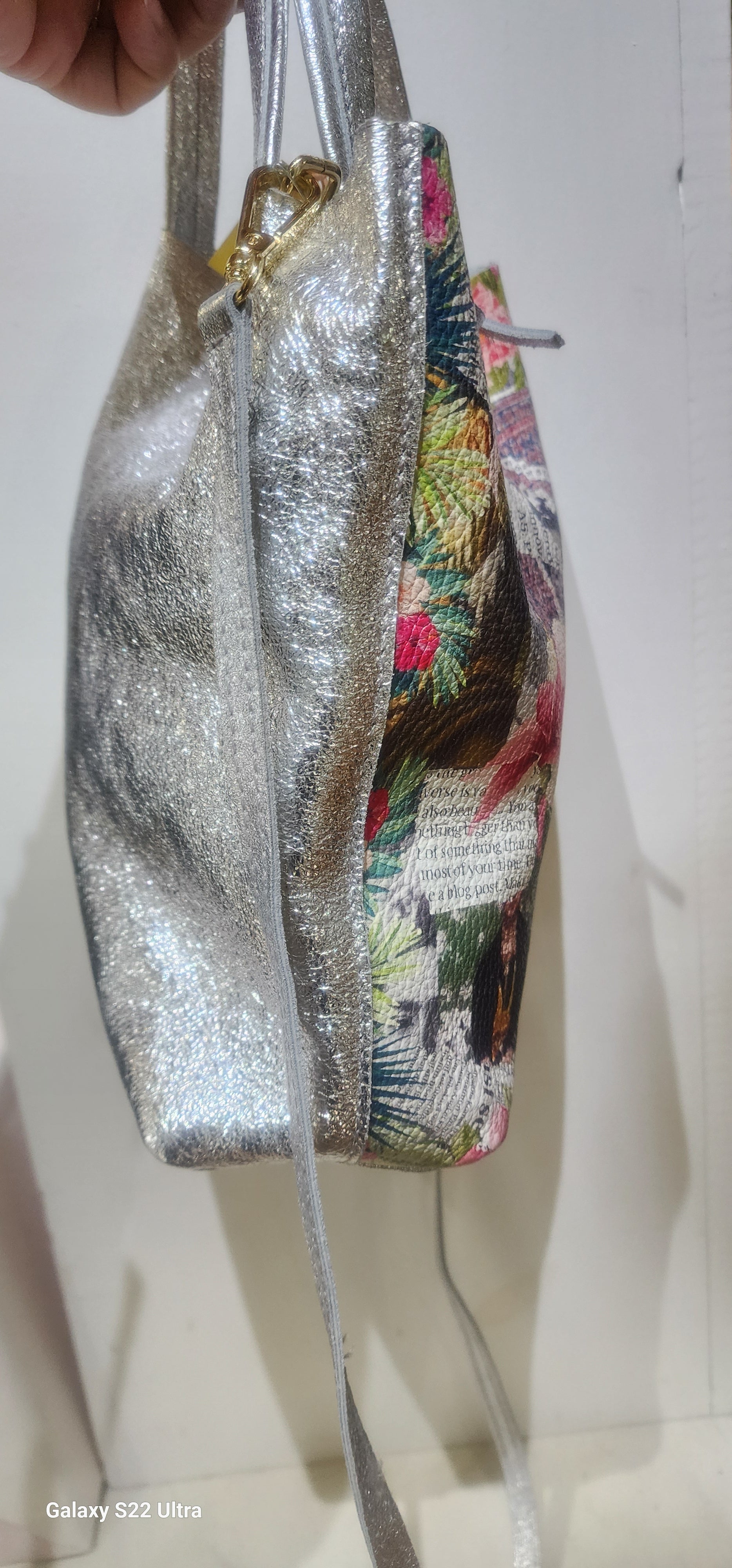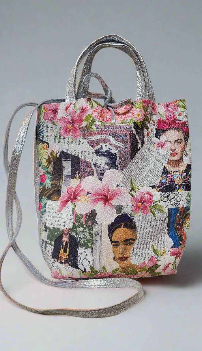 Introducing our newest addition, the Frieda mini tote crossbody bag! Made of luxurious metallic silver leather, this bag features a stunning image of FRIEDA KHALO. Carry your essentials in style and make a statement with this elegant and exclusive piece.