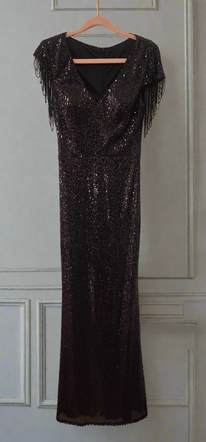 Evening long black sequence with draped fringe