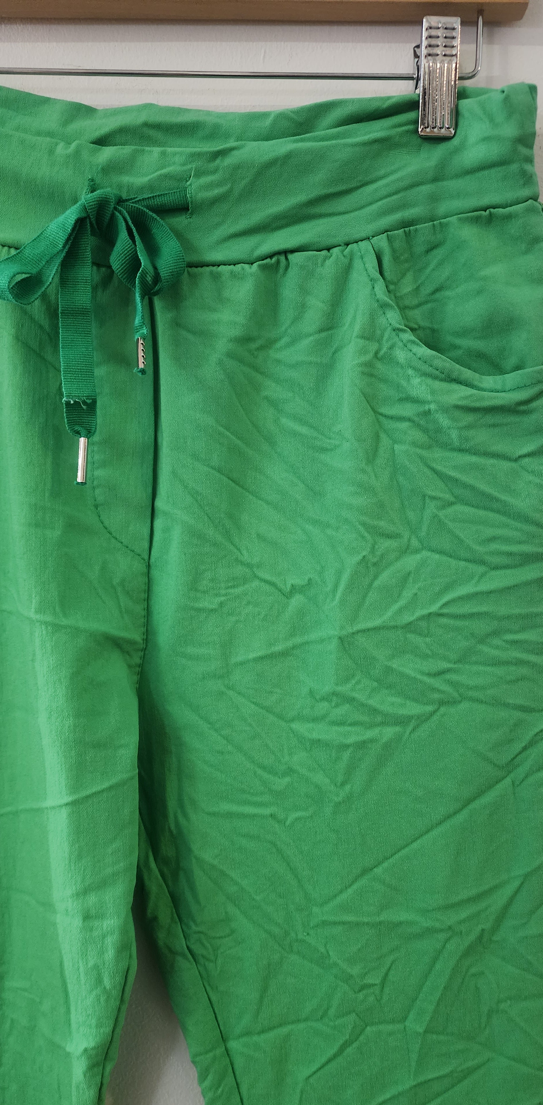 Expertly crafted in Italy, these high waist pants are designed for ultimate comfort and style. Made with stretchy fabric, these slim fitting pants feature a drawstring waist and front and back pockets. Perfect for travel, they have a natural wrinkled texture that stretches to contour your body shape for the perfect fit.