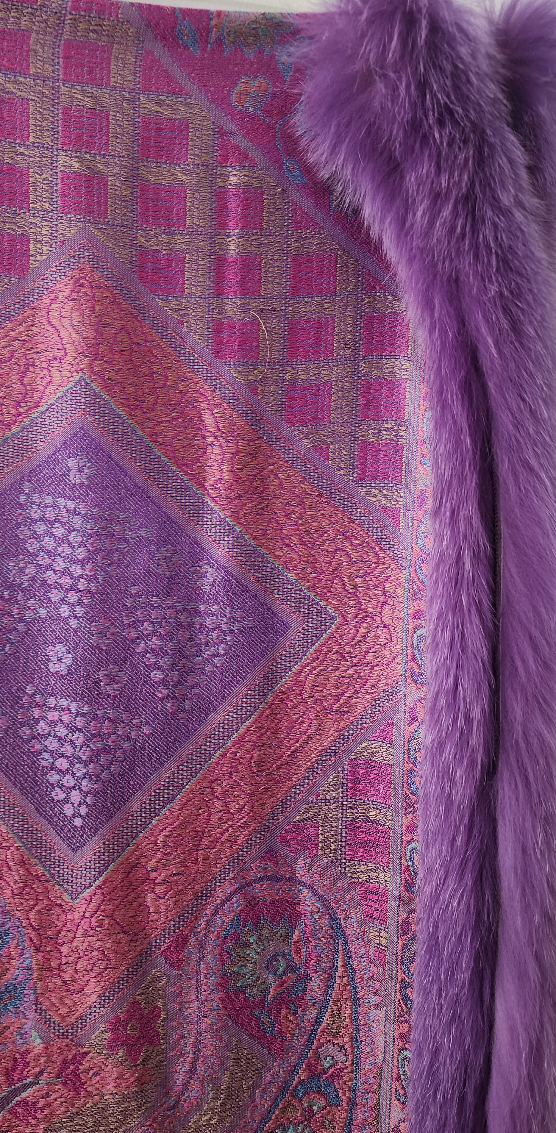 Indulge yourself in luxury with our Shawl pink silk with purple fox trim! Made from 100% pink silk, this shawl is truly spectacular. The elegant purple fox trim adds a touch of sophistication to any outfit. Stay warm and stylish all at once with this must-have accessory!